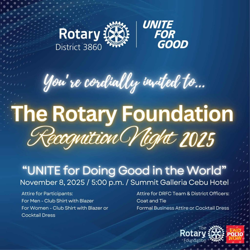 Your data will not be shared with any third party outside the organization and will be retained for one (1) year after the conclusion of Tri-District Visit (D3850, D3860, D3870) of TRF Trustee Chair Holger Knaack and Spouse Susanne and Regional Rotary Foundation & Membership Awards Ceremony for documentation and reporting purposes. After this period, your data will be securely deleted or anonymized.